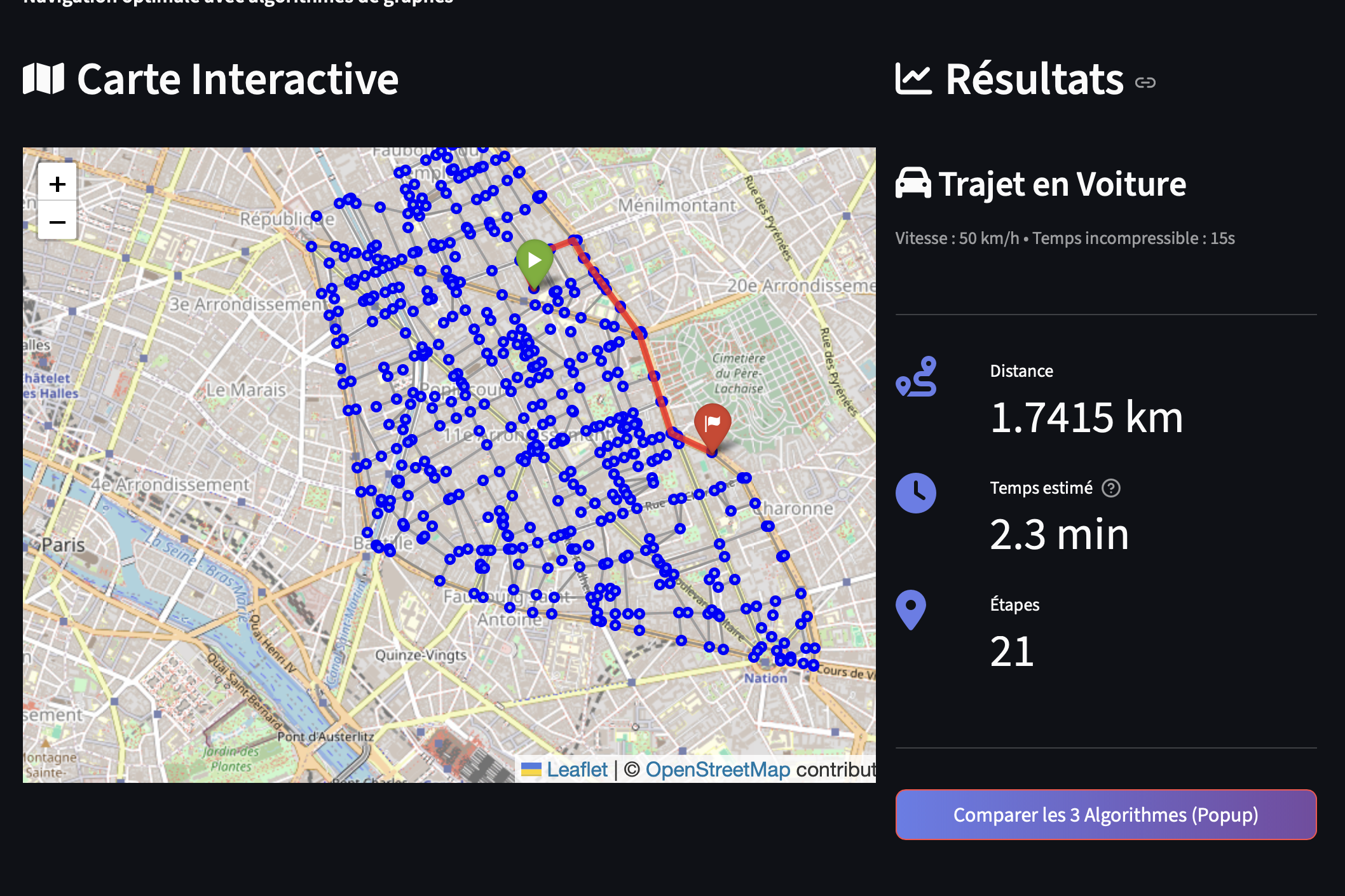 Le chemin optimal est affiché visuellement sur le graphe, avec estimation du temps de trajet basée sur un modèle réaliste incluant les coûts incompressibles (démarrage, arrêts, feux).