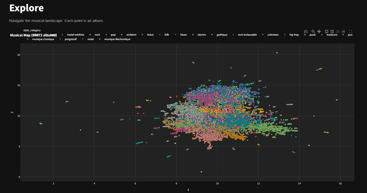 Projection UMAP, carte interactive de l'espace latent, exploration visuelle de 14 000 albums.