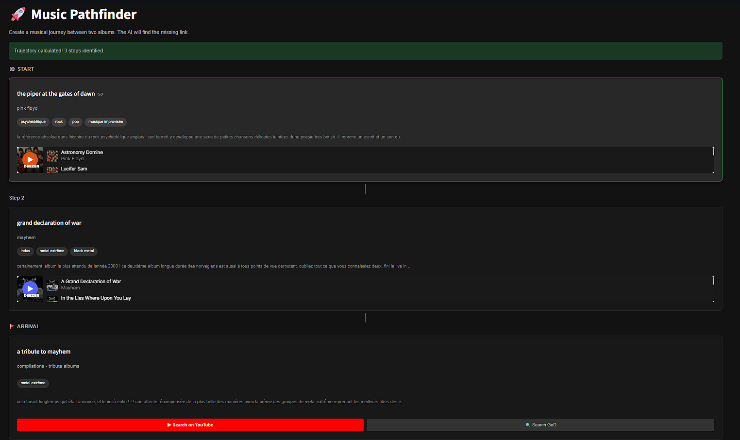 L'idée : au lieu de dire "les utilisateurs qui aiment X aiment aussi Y", le système cherche à comprendre pourquoi deux albums se ressemblent — à travers leurs chroniques, leurs styles et leur texture sémantique.